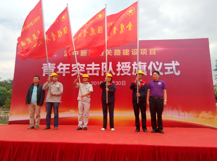 滇中新區(qū)哨關路建設項目共計8支青年突擊隊,由各個參建單位分別組建而成,路橋總承包部黨總支書記李家舜、集團團委副書記楊瑜、滇中新區(qū)哨關路建設指揮部副指揮長閉春華和哨關路投資建設有限公司工程部部長程剛為青年突擊隊授旗。公司“金鷹青年突擊隊”由公司路橋一部項目經(jīng)理王孝生擔任隊長,項目部35歲以下青年職工共計17人組成。根據(jù)青年突擊隊競賽考核書,本次青年突擊隊競賽活動從2016年6月1日至2016年12月31日止,以“安全、質(zhì)量、進度、創(chuàng)新、技能和形象”為主題開展。