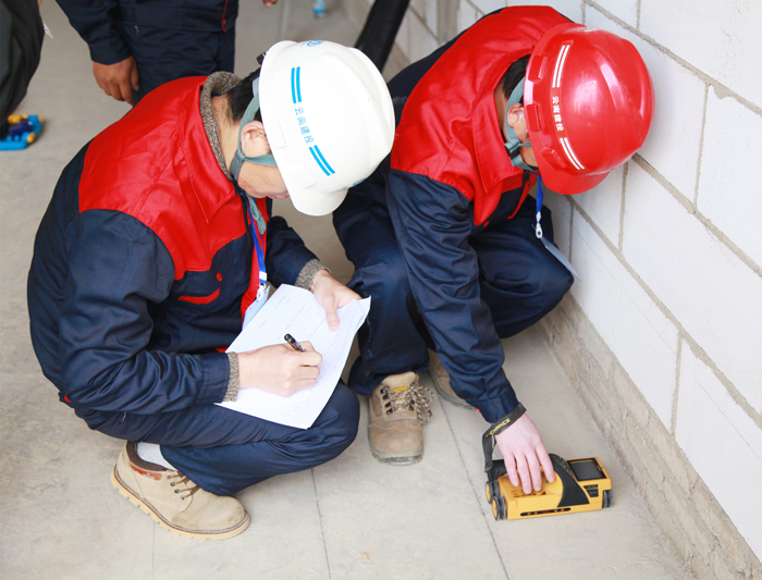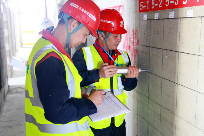競賽歷時(shí)一天,共有來自18個(gè)直管部的108名參賽選手參加,按照比賽規(guī)則分為A、B兩組,每組三人。比賽地點(diǎn)設(shè)置在興冶廣場建設(shè)項(xiàng)目一標(biāo)段一棟號5樓,設(shè)有6個(gè)比賽工位。參賽選手們摩拳擦掌,賽前仔細(xì)檢查設(shè)備,在裁判“開始競賽”的口令后,迅速進(jìn)入比賽狀態(tài)。檢測樓板厚度、激光測量距離、混凝土鋼筋的進(jìn)一步檢測……每一步,都要精準(zhǔn)。他們不慌不忙,分工明確,一個(gè)人測量,一個(gè)人記錄數(shù)據(jù),另一個(gè)人則根據(jù)測量的數(shù)據(jù)進(jìn)行計(jì)算。裁判們也以嚴(yán)謹(jǐn)?shù)膽B(tài)度和“公平、公正、公開”的原則認(rèn)真記錄。比賽時(shí),常常有陣陣涼風(fēng)透過未封的單側(cè)墻面,朝競賽人員和裁判呼嘯而來,但他們絲毫不受影響,現(xiàn)場充滿了愛崗敬業(yè)、鉆研技術(shù)的濃厚氛圍。