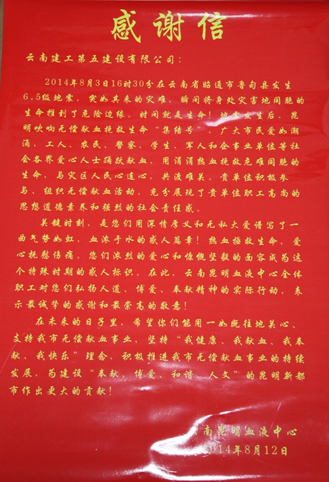 “關(guān)鍵時(shí)刻,是您們用深情厚誼和無私大愛譜寫了一曲氣勢如虹,血濃于水的感人篇章……”8月19日,云南昆明血液中心向公司贈(zèng)送感謝信。