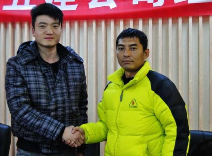 圖為翰業(yè)造價公司副總經(jīng)理李云輝(右)與翰業(yè)職工簽訂協(xié)議后合影