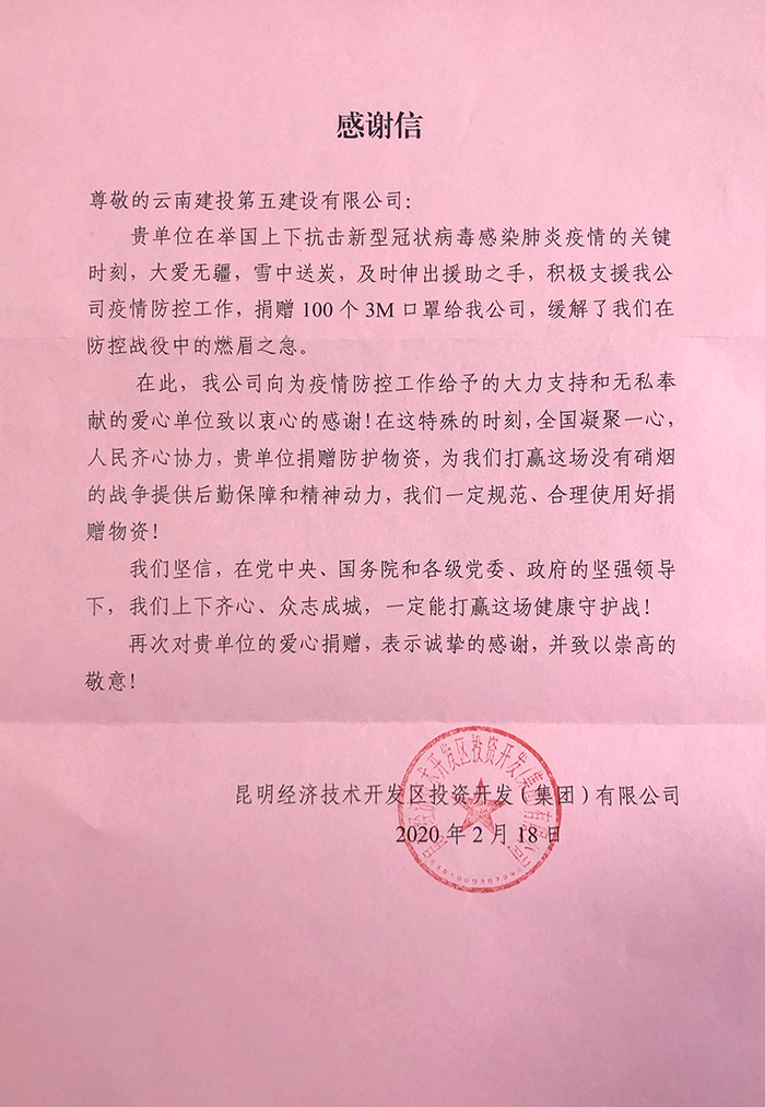 【共同戰(zhàn)疫】捐贈防護(hù)物資 公司收獲昆明經(jīng)投感謝信