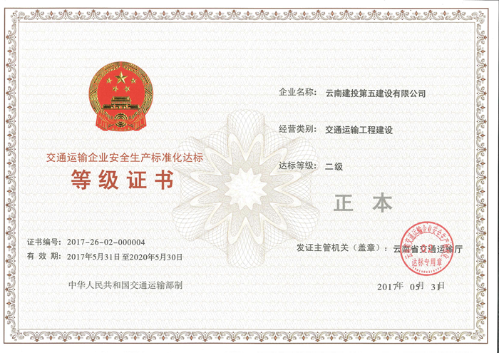 6月2日,公司取得由省交通廳頒發(fā)的交通運輸工程建設(shè)安全生產(chǎn)標(biāo)準(zhǔn)化達(dá)標(biāo)二級證書。此證書作為公路工程施工總承包資質(zhì)使用的必備條件,將與公司公路工程施工總承包貳級資質(zhì)配套使用,對公司今后獨立承接公路工程項目具有重要意義。 今年2月9日,公司成功申報獲得公路工程施工總承包貳級資質(zhì),根據(jù)《云南省交通運輸廳關(guān)于開展交通施工企業(yè)安全生產(chǎn)...