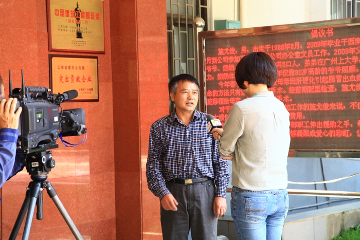 ??? 9月11日,云南日報(bào)、云南廣播電視臺(電視、電臺)、云南網(wǎng)、春城晚報(bào)、云南信息報(bào)、云南政協(xié)報(bào)、云南法制報(bào)、生活新報(bào)等多家媒體組成記者團(tuán),由省委宣傳部宣傳教育處帶隊(duì)到公司對施尤俊捐肝救母的感人事跡進(jìn)行相關(guān)采訪。 ??? 公司董事長李文智,黨委書記李興奎,黨委副書記、紀(jì)委書記吳倩等領(lǐng)導(dǎo)及部分干部職工配合接受了媒體采訪。 ??? 8月20日,《云南日報(bào)》和《春城晚報(bào)》分別推出《80后小伙捐肝救母…