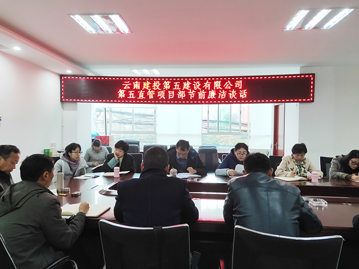 1月2日,第五直管項(xiàng)目部黨支部召開專題會(huì)議,開展節(jié)前廉潔談話。由黨支部書記對(duì)直管部領(lǐng)導(dǎo)班子成員、部門、項(xiàng)目部主要負(fù)責(zé)人、黨員、二線部門管理人員進(jìn)行了一次集中廉潔談話。會(huì)上,黨支部組織黨員集中學(xué)習(xí)了集團(tuán)印發(fā)的《云南省建設(shè)投資控股集團(tuán)有限公司紀(jì)委關(guān)于加強(qiáng)2019年元旦、春節(jié)期間紀(jì)律作風(fēng)建設(shè)的通知》。 黨支部要求黨員干部要進(jìn)一步強(qiáng)化紀(jì)律和規(guī)矩意識(shí),緊繃思想作風(fēng)之弦,始終守住做人、處事、...
