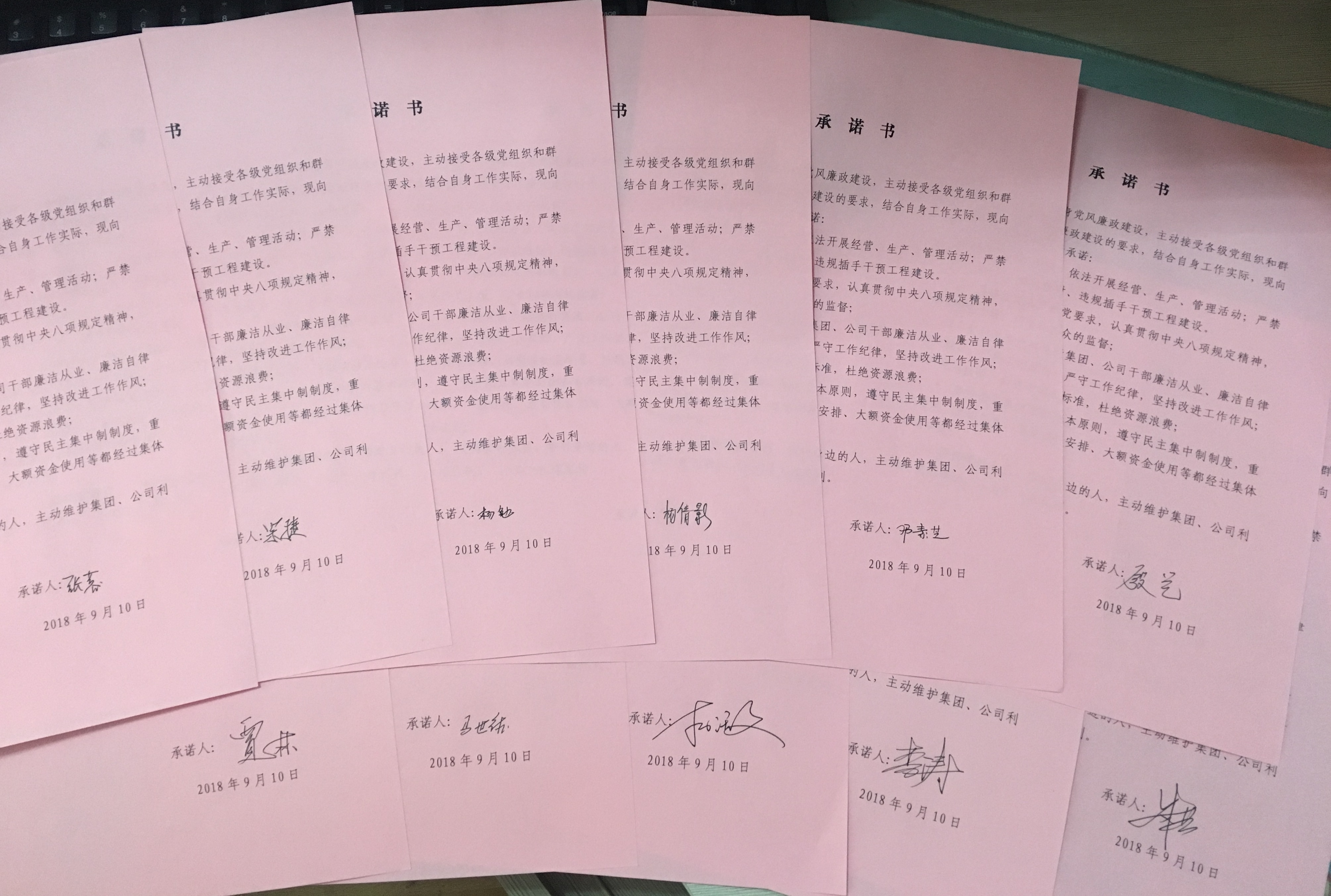 9月10日,五〇四直管部黨支部為進(jìn)一步強(qiáng)化黨風(fēng)廉政建設(shè),增強(qiáng)領(lǐng)導(dǎo)干部、業(yè)務(wù)骨干的廉潔從業(yè)意識(shí),,組織領(lǐng)導(dǎo)班子成員、項(xiàng)目經(jīng)理及科室負(fù)責(zé)人共計(jì)簽訂“承諾書(shū)”17份。直管部領(lǐng)導(dǎo)干部及業(yè)務(wù)骨干向黨組織和廣大職工群眾做出公開(kāi)承諾:帶頭遵紀(jì)守法,依法開(kāi)展經(jīng)營(yíng)、生產(chǎn)、管理活動(dòng),嚴(yán)格落實(shí)從嚴(yán)治黨要求,認(rèn)真貫徹中央八項(xiàng)規(guī)定及其實(shí)施細(xì)則精神,堅(jiān)持帶頭執(zhí)行集團(tuán)、公司干部廉潔從業(yè)、廉潔自律相關(guān)規(guī)定,堅(jiān)持改進(jìn)工作作風(fēng),貫徹…
